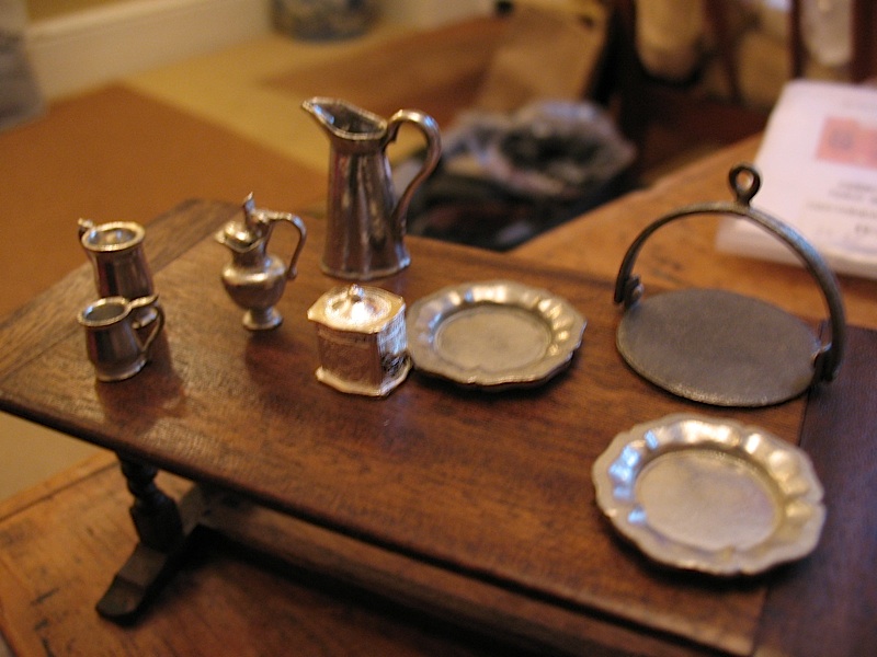 I splurged a little on this Tudor standing light fixture for the castle. I liked the mortar and pestle and the giant tankard, and the little gravy boat is by Warwick Miniatures and is destined for the William and Mary house.