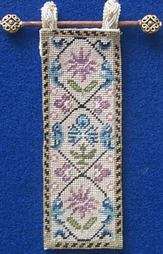 This Tudor pattern comes from Sandra Whitehead's book Celtic, medieval and Tudor wallhangings in 1/12 scale needlepoint.  I worked it over three and a half days, which made a pleasant change from working on something that took 2 and a half months :)  I changed a few colours and stitched it on 26 count linen with two strands of cotton floss.