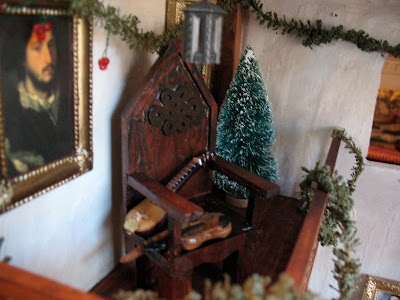 This shows the fireplace in greater detai, plus the painting I hung and the lectern.  The logs/fire in the fireplace I bought from eBay seller Kerby Lane Miniatures.