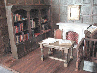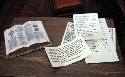 I bought the small packet of papers you see here in closeup on the libary table from the same UK miniature maker (Pear Tree Miniatures)  who made the Tres Riches Heures open book you see in the above photo, on the lectern.  This Tudor package includes a map, two letters and a list of household accounts. The open book on the table is one I made.