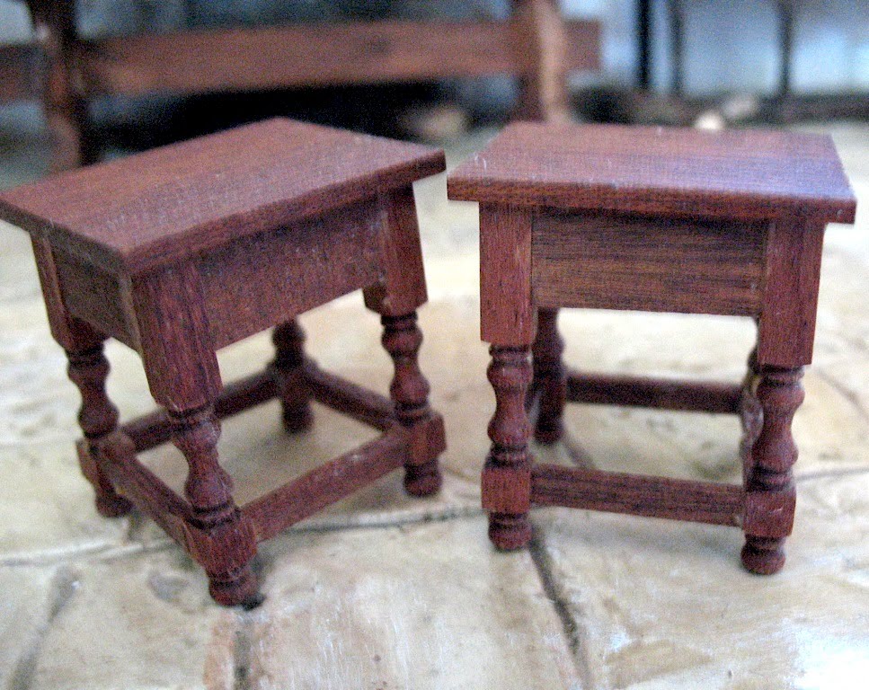 I wanted some joint stools for the castle, so I ordered two kits from McQueenie Miniatures in the UK.  This is a great source for early British furniture, both in kit form and ready made.  Want to make your own aumbry?  McQueenie sells a kit!