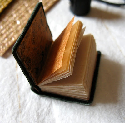 I wish you could all touch this book because it's a tiny masterpiece.  It's bound just like a real book, and has endpapers and very thin pages -- the next photo is my lame attempt to show a bit of what I mean: