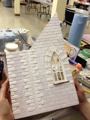 My piece is gluing up and I've added the wood trim. Tomorrow, I landscape! One of the things I finished today was this rather rough little grate and stove for the crofter's cottage's fireplace -- it's all made from mat board with a Tic Tac bed of coals :)